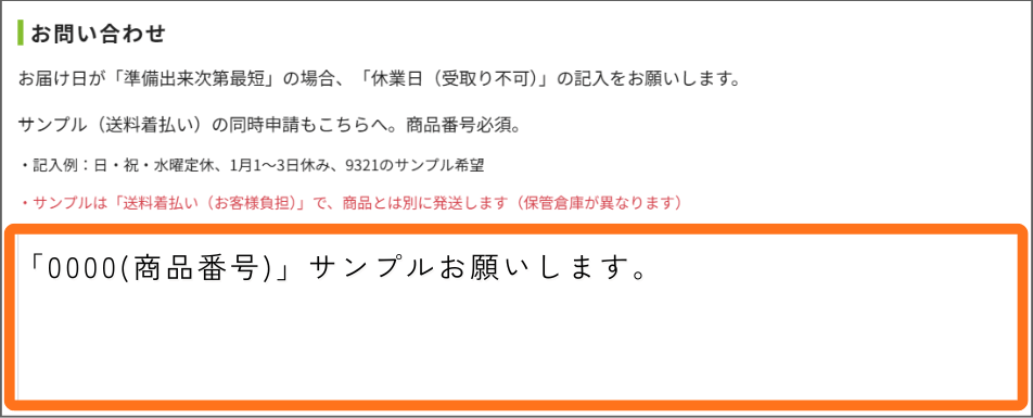 お問い合わせ欄に「商品番号」「サンプル依頼」の旨を記載ください。(参考:下記画像)